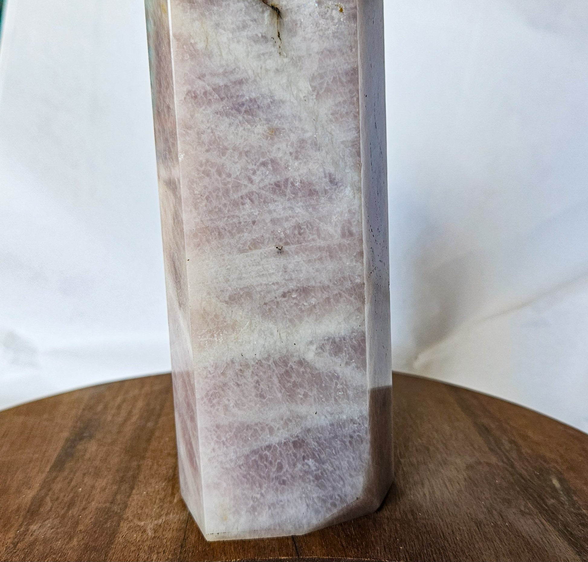 Weighing 2 pounds 3 ounces and standing 7.4 inches tall with a 2.5-inch base, this polished crystal point glows with pale lilac and blush tones that shimmer in the light.